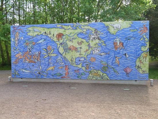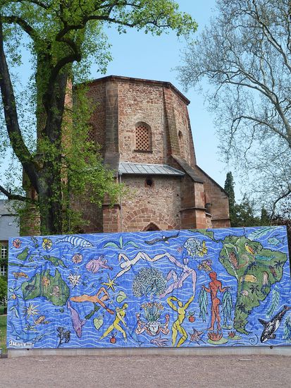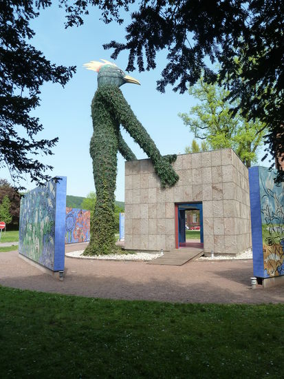Er liegt im Gelände der alten Abtei und hat sozusagen als Nachbarn eine Montage aus der Weltausstellung mit 6 riesigen Wänden, die mit Motiven der Erdteile in Keramik-Puzzleteilchen bestückt sind. Daran angelehnt ist eine Riesenfigur eines Vogels. Wir fragen eine Dame nach der alten Abtei - sie arbeitet darin, weiß aber nicht, dass es eine Abtei war. Für sie war es immer Villeroy & Boch.