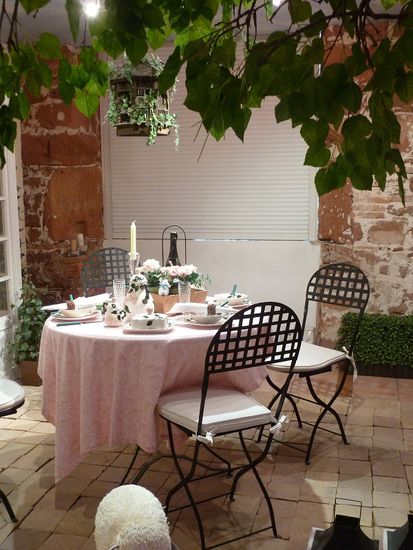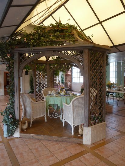 Nach Abschluß dieser Besichtigung müssen wir zurück und schaffen es bis etwa 18.00 Uhr - unser Wirt an der Hauptstraße winkt uns zu. Aber wir müssen uns umziehen fürs Sternemenu. Etwa 25 km durch die Walachei ins entlegenste Eckchen führt uns der Weg in die Sackgasse zum Landhaus Mühlenberg, wo uns der Besitzer am Eingang per Handschlag begrüßt; trotz der Wärme nehmen wir den Aperitif innen, dazu gibt es zwei winzige Stücke Salzgebäck und warme Quiche. Im sehr nett mit Möbeln unterschiedlichster Stile und vielfältiger Osterdekoration eingerichteten Lokal studieren wir die Karte, auf der es keine Alternativen gibt. Es gibt Menu oder Menu! Aber man kann wählen zwischen 5 und 6 Gängen (75 oder 93€)