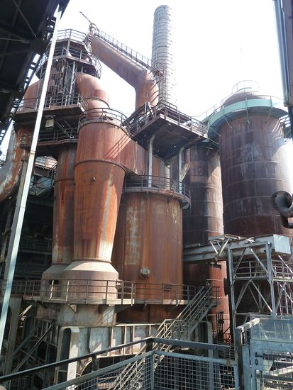 Eine Besteigung der Aussichtsplattform inmitten des Geländes am Hochofen muß ich natürlich wegen der durchsichtigen Treppenstufen alleine machen.