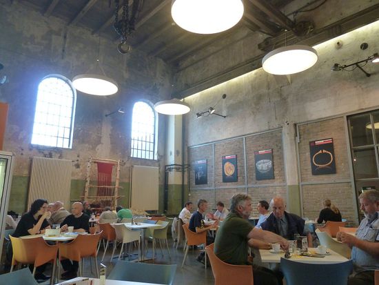 Im Museumsshop findet Ulrike eine schöne Korallenkette mit Silberverarbeitung und ein dazu passendes Armband. Durst meldet sich, aber das Würstchenbistro am Ausgang gefällt uns nicht, daher gehen wir ins Café Umwalzer, das wohl in einem ehemaligen Schaltraum untergebracht ist. Ulrike trinkt eine Apfelschorle und ißt dazu eine 'Fritte', ich bleibe bei Kaffee und Streuselkuchen.