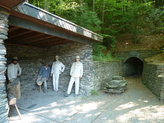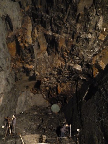 Nach einer guten Stunde entläßt er uns wieder und wir folgen der Straße zurück entlang des Hanges und können noch weitere Mundlöcher erkennen. Z.T. mussten die Bergleute 50 m in den Berg hineingraben um an guten Schiefer zu kommen. Ein Bergwerk geht danach ca. 600m parallel zum Hang.