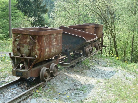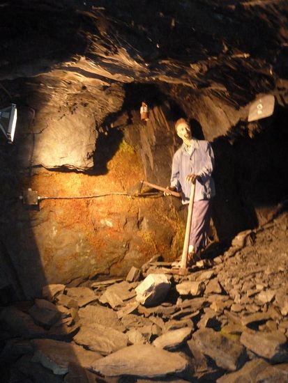 Enttäuscht ziehen wir ab und fahren zum Besucherbergwerk Fell.Dort müssen wir noch eine Viertelstunde warten, bevor uns der Führer zusammen mit vier Personen aus der Ukraine durch die Stollen der Bergwerke Hoffnung und Barbara führt.