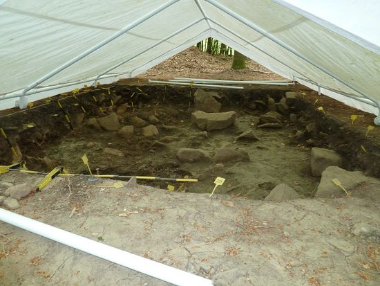 Als erstes steht der Keltenring bei Nonnweiler auf dem Programm; wir können einen nicht abgesperrten Waldweg bis fast an den Ring hochfahren und den Ring an der nördlichsten Stelle überqueren und im Inneren einige Ausgrabungsstellen anschauen.