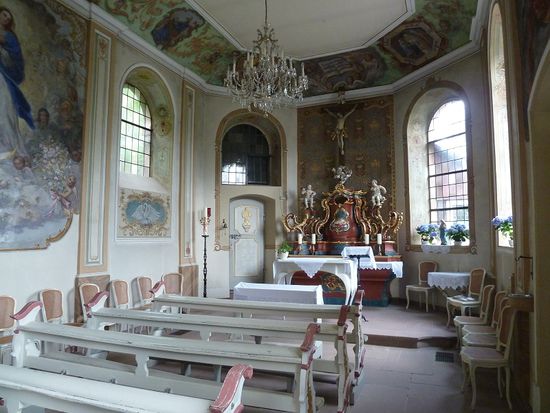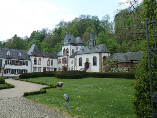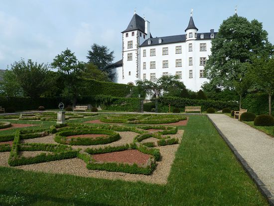 Danach wollen wir einige Gärten besuchen, zunächst den Barockgarten an Schloß Dagstuhl, das heute als ein Zentrum für Informatik genutzt wird. Daher kann man vom Schloß nur die im spätbarocken Stil erhaltene Kapelle besichtigen. Der Barockgarten ist klein aber sehr hübsch angelegt.