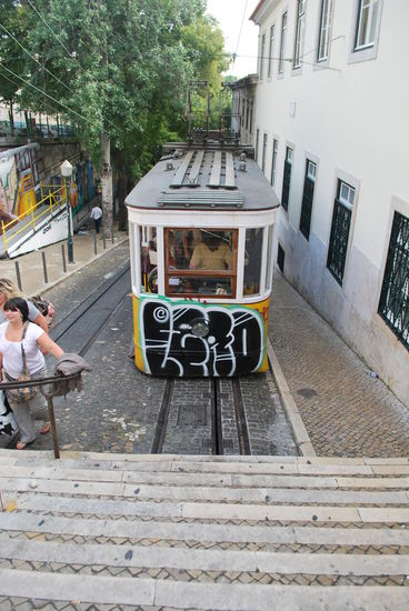 Der Elevador da Glória ist mein Ziel, dieser ist eine Standseilbahn, früher mit Dampf, heute elektrisch betrieben, wie alle elevadores in Lissabon. So wie ich das mitbekommen habe, fahren die Dinger nicht nach Fahrplan, sondern immer dann, wenn sie voll oder wenigstens einigermassen voll sind. Es geht eine wirklich extrem steile, enge Gasse hinauf.