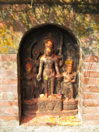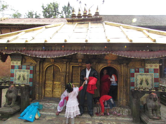 In Changu Narayan haben sie uns dann die diversen Tempel erklärt und uns zum Tee eingeladen. Bis hierher waren wir bereits 4,5 Stunden unterwegs Danach folgte ein steiler Abstieg der nochmals 1 Stunde dauerte und sehr in die Beine ging, da es viele Treppenstufen waren und auch sehr steil war. An der Straße angekommen haben sie uns ein Taxi angehalten und wir sind erst zum Flughafen, da Pia's Gepäck endlich angekommen war (war bei Ihrer Landung leider nicht im Flieger gewesen) und sind dann zu Yolanda gefahren.