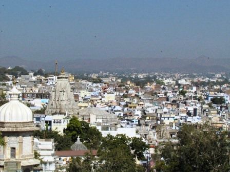 links sieht man den Fateh Sagar See und rechts den Pichola See