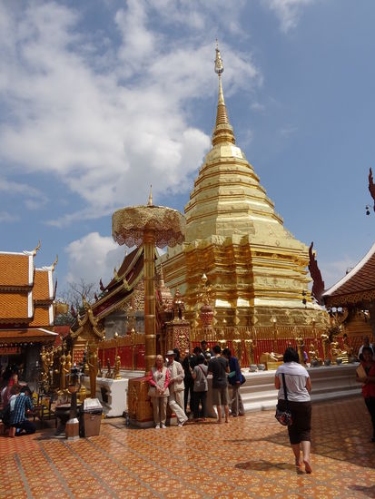 Heute haben wir noch den wichtigsten Tempel in Chiang Mai den Wat Phra That Doi Suthep besucht, der 16 km ausserhalb von Chiang Mai liegt. Wir sind mit einem Sammeltaxi auf den Berg raufgefahren was eine ziemlich ruckelige Angelegenheit war (wir waren froh wieder aussteigen zu dürfen