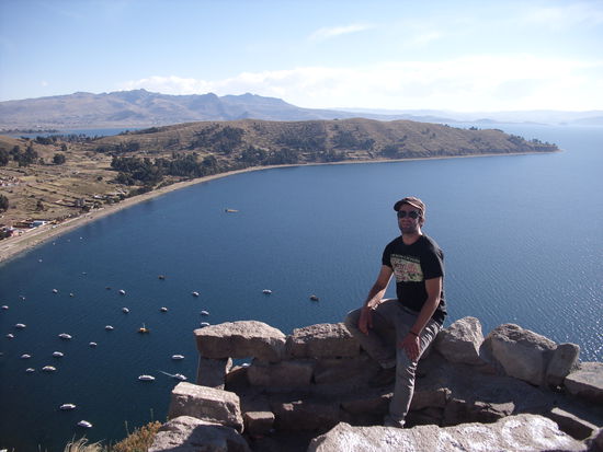 Die Fahrt von La Paz nach Copacabana (ca. 150km) dauerte, inklusive Bootsueberfahrt, etwa dreieinhalb Stunden. Aus dem Bus konnten wir bereits den tollen Ausblick auf den riesigen See werfen, als sich die Strasse an der Steilkueste entlangschraubte. Insgesamt ist der See etwa 15 Mal groesser als der Bodensee und liegt auf ueber 3800 m Hoehe. Zum Glueck sind wir inzwischen ziemlich gut akklimatisiert und konnten so gleich mal auf den Hausberg klettern, um einen super Ausblick auf die Umgebung zu geniessen.