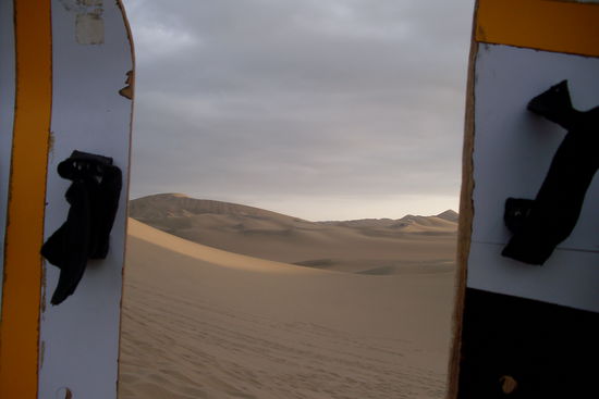 Unser Fahrer schien irgendwie ein bisschen verrueckt zu sein, jedenfalls holte er das Letzte aus seinem Fahrzeug und ueberholte jeden anderen Buggy, den wir unterwegs trafen. Die Duenen rauf und kreischend wieder runter, manchmal mehrere Meter weit springend, ging es immer weiter in die Sandwueste. Irgendwann, nachdem wir uns schon "alle" halb heiser geschrieen hatten, hielten wir, um die Sandboards auszupacken. Erstmal ging es auf dem Bauch kleinere Duenen hinunter, dann durften wir es auch im Stehen versuchen. Auf diesem weichen Sand ist Boarden viel schwerer als im Schnee! Ausserdem hatten wir ein bisschen Angst, uns auf die letzten Tage noch mit einem Baenderriss ausser Gefecht zu setzen, also blieben wir bei den wirklich grossen Duenen lieber beim Rutschen auf dem Bauch, ein Riesenspass! Auf dem Rueckweg zur Oase gab unser Fahrer nochmal alles, jagte dem Sonnenuntergang entgegen und durch steile Sandkessel. Da waren doch alle froh, als wir heilgeblieben mit laut quietschenden Reifen unsere Rueckkehr am Hostel ankuendigen konnten.