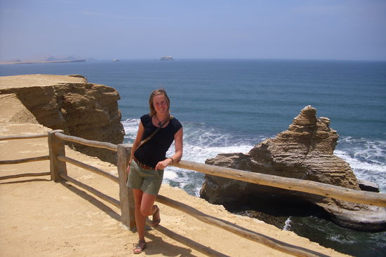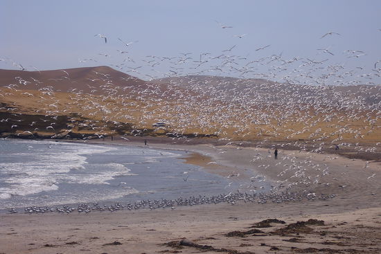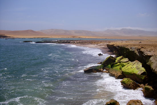 Am naechsten Tag ging es in den Nationalpark auf der Halbinsel von Paracas. Die erste Station an der Steilkueste hat bis 2008 die "Kathedrale", eine Felsformation im Meer, gezeigt, dann stuerzte das fragile Gebilde allerdings bei einem Erdbeben ein. Faszinierend ist, wie hier die Wueste - Regen gibt es praktisch nie - direkt auf den tosenden Pazifik trifft!