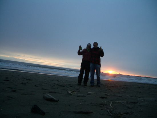 Vor der untergehenden Sonne tollten wir am Strand entlang und stiessen auf den Beginn unseres Abenteuers an.