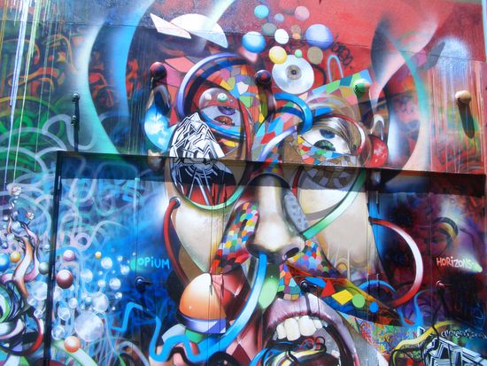 Restaurant, neben Cafe, Secondhand-, Souvenirshops und Taettowierern und vielen Strassenmusikern.