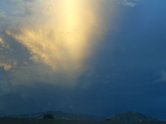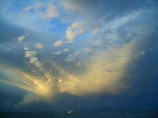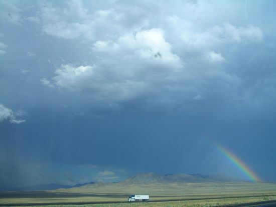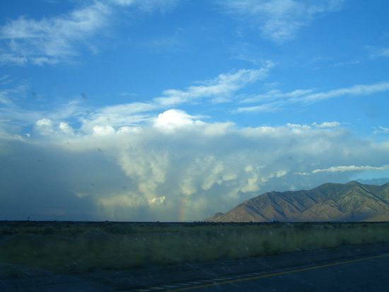 Die Gewitter, die man in der Wüste Nevadas auf der einen Seite sieht, während auf der anderen die Sonne scheint.