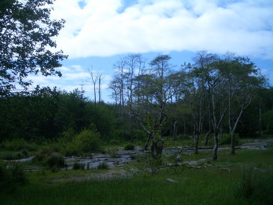 Auf der einen Seite gruener, blumiger Sumpf, auf der anderen in der Hitze flirrender Strand.