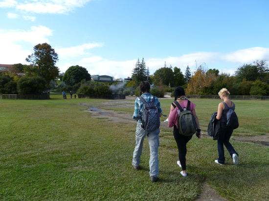 Nachdem wir am Morgen das mit im Preis inbegriffene Frühstück zu uns genommen hatten, ging es wieder einmal um 8 Uhr los. Ziel des heutigen Tages war das sehr schöne Örtchen Taupo, was direkt an einem wunderschönen und riesigen See gelegen ist. Auf dem Weg machten wir einen Zwischenhalt in Rotorua, was vor allem durch seine geothermalen Aktivitäten bekannt ist. Dort bekommt man unter anderem die Gelegenheit verschiedene Geysire zu bestaunen. Überall im Ort kommt Dampf aus den Gullis oder aus den vor sich herblubbernde Erdlöchern und man ist jederzeit von dem typischen Schwefelgeruch, der einen Stark an den Duft von verfaulten Eiern einnert, umgeben. In diesem ansonsten sehr schonen Ort hatten wir nun ein paar Stunden Zeit, um ihn auf eigene Faust zu erkunden. In der Touri-Info hatte man uns dann empfohlen den "Lake Rotorua" und die Geothermalquellen zu besichtigen und mit der Sonne im Nacken machten wir uns auf dem Weg.