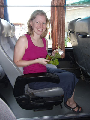 An der Bushaltestelle werden Tickets in alle Himmelsrichtungen verkauft, man kann von hier auch direkt nach Bangkok fahren. Die Dame beim Ticketverkauf verliert nie den Überblick wer wohin will und gibt den Kunden dann ein Zeichen, wenn der entsprechende Bus einfährt. Es läuft alles wie am Schnürchen, und so saßen wir bald im Bus nach Surat Thani, der beim Khao Sok NP Halt macht.