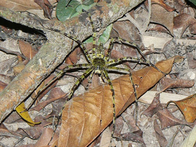 Am Abend machten wir dann noch eine Nachtsafari durch den Dschungel. Wir machten uns keine allzu großen Hoffnungen, größere Tiere zu sehen, aber die Atmosphäre im nächtlichen Dschungel mit all seinen Geräuschen alleine war schon ein Erlebnis. Wir sahen eine Menge (handtellergroße) Spinnen, Nachtfalter und verschiedene andere Insekten, kleine Echsen, Frösche und einmal an einem Bach ein etwa katzengroßes Säugetier, dessen Namen Boo, der wieder unser Guide war, leider nicht auf englisch wusste. Es war so schnell im Unterholz verschwunden, dass ich nur einen sehr flüchtigen Blick darauf erhaschen konnte. Boo hat es mit "mouse" umschrieben, aber das müsste schon eine sehr große Maus oder Ratte gewesen sein.