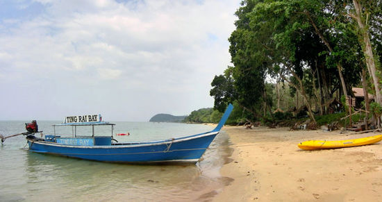 Mit dem Longtail fuhren wir dem Strand entgegen, und bald erschien das Ting Rai Bay Resort am Ufer - idyllisch eingebettet in die dichte, grüne Vegetation. Wir wurden mit einem Drink willkommen geheißen, und dann bezogen wir unseren liebevoll eingerichteten Bungalow. Wir hatten eine kleine Terrasse und gleich zwei Doppelbetten!
