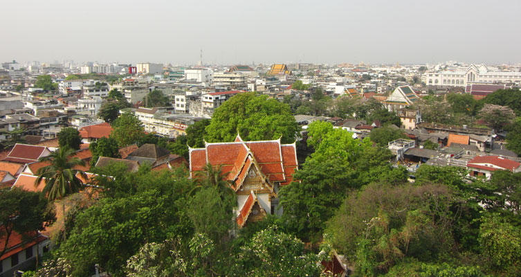 Wir starteten unseren letzten Tag in Thailand mit der Besichtigung des Golden Mount im Wat Saket. Auf einem 79 m hohen, künstlich aufgeschütteten Hügel thront über dem Tempelgelände ein vergoldeter Chedi. Der Aufstieg war selbst am Vormittag schon sehr schweißtreibend, aber der Ausblick von oben entschädigt für die Mühen.