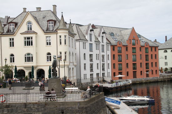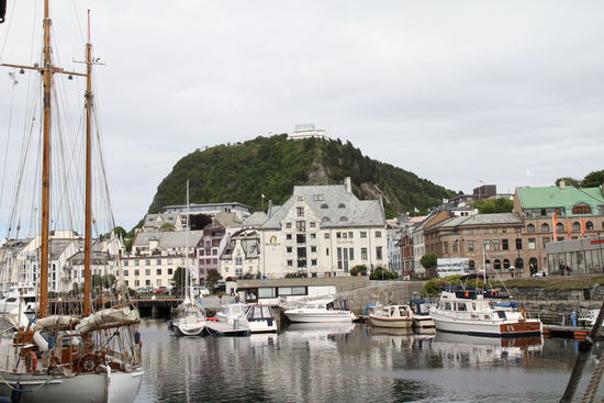Zunächst war es allerdings an der Zeit, diese traumhafte Stadt nAlesund zu erkunden. Daher suchten wir uns einen Parkplatz im westlichen Teil der Stadt und zogen mit unserem kleinen Racker los. Eins können wir vorwegnehmen, diese Stadt ist einfach der Hammer. Sowohl von der Sauberkeit, als auch von den architektonischen Gegebenheiten war dieses Stadt sehenswert. Wir zogen in die Altstadt, entlang des großen Key wo wir ein Kreuzfahrtschiff bestaunten um abschließend zur ältesten Kirche der Stadt zu wandern. Von dort ging es hinunter zum Hauptplatz von dem aus wir wieder langsam zu unserem WoMo schlenderten um erst einmal eine kleine Brotzeit einzunehmen.
