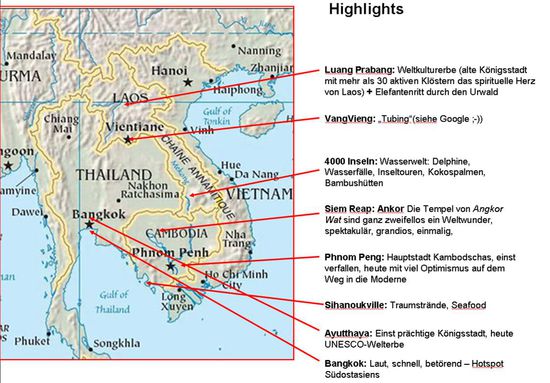 Nach den großartigen Erfahrungen unserer letztjährigen Tour durch das Reich der Mitte, soll es nun wieder Asien sein. Wir werden in Bangkok starten und eine große Runde durch Laos und Kambodscha drehen, um am Ende wieder in Bangkok zu landen. Wir erwarten ein völlig neue Welt mit neuen Erlebnissen, die uns ein Leben lang im Gedächtnis bleiben. Wie immer lässt sich nicht alles planen - und weil das eben so ist, wollen wir euch auch dieses Jahr wieder auf unsere Reise mitnehmen.