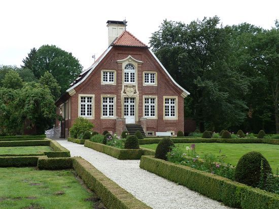 Das Rüschhaus stellt eine Verschmelzung eines typisch münsterländischen Bauernhauses mit einer Dreiflügelanlage eines Herrensitzes dar