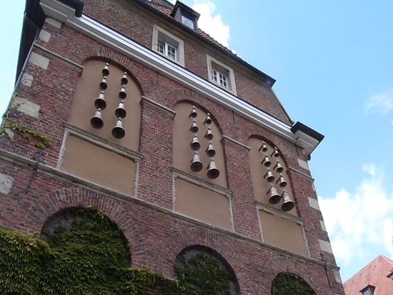 An einem Giebel sind 24 Glocken angebracht, die zu bestimmten Zeiten automatisch angeschlagen werden.