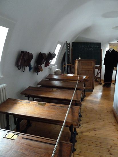 Nur in den beiden Torhäusern gibt ein kleine Ausstellung - im linken zur Architektur und im rechten ein kleines (privates) Schulmuseum.