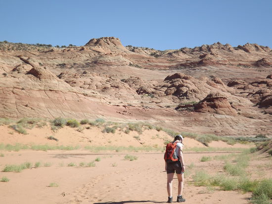 Nach ca. 4 Meilen stacheliger Tortur kamen wir unserem Ziel immer näher. Ein letzter anstrengendes Wegstück lag aber noch vor uns. Wir bogen von dem ausgetrockneten Fluss in eine sandige Wash ab. Dies bedeutete noch eine gute Meile durch tiefen Sand stapfen. Dort gab es leider keine Möglichkeit den Sand zu umgehen. Also befanden sich in unseren Schuhen außer den piksenden Stacheln noch roter Sand. Eine ganz tolle Mischung... Eine Gelegenheit die Schuhe aus zu ziehen um den Sand und die Stacheln los zu werden hatten wir leider erst nachdem wir an unserem Ziel angekommen waren.