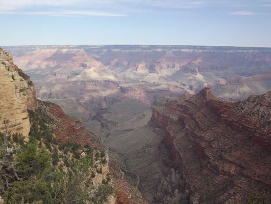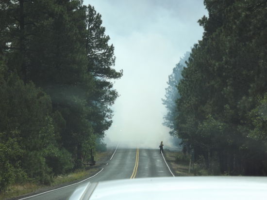 Die ganze Straße war voll mit Rangern und Feuerwehrleuten. Wir mussten dort eine geraume Zeit warten bis wir von einem Ranger mit Blaulicht durch die verqualmte Strecke geleitet wurden. Das hätten die Nachts mal machen sollten, denn die Sicht war wirklich gut, im Gegensatz zu nachts. Unser Besuch am Grand Canyon beschränkte sich nur auf Fotostopps an verschiedenen Aussichtspunkten denn das ließ zu wünschen übrig. Es war sehr bewölkt und diesig, so das man eine nicht so tolle Sicht hatte.
