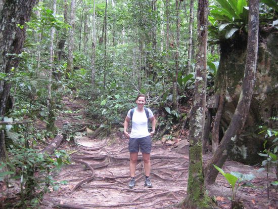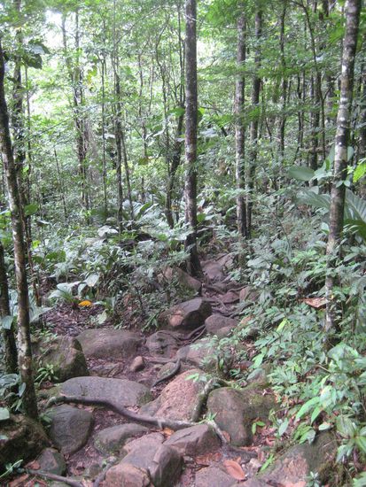 Am nächsten Morgen hat es dann Gott sei Dank aufgehört zu regnen. Um 7 Uhr gibt es Frühstück: Arepas, Rührei, Schinken, Käse und Cracker. Schmeckt alles recht gut. Um 8 Uhr geht es dann los und wir laufen an den Fuß von Angel-Falls. Zuerst bringt uns das Boot über den Fluss und dann geht es über Stock und Stein den Berg hoch. Es ist ganz schön schwül und daher auch recht anstrengend. Mir läuft nur so die Brühe runter ...