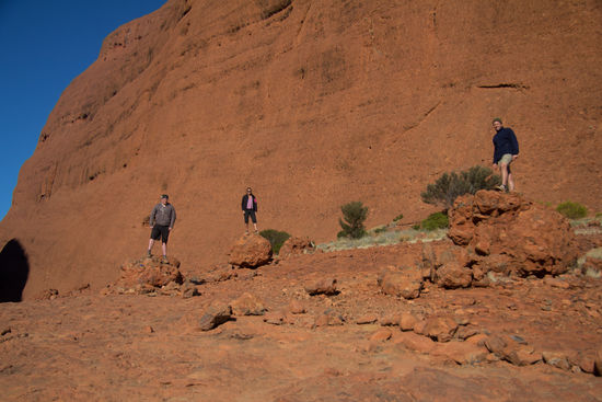 Am nächsten Tag standen wir früh auf da wir uns auch noch den Sonnenaufgang geben wollten. Leider sprang unser Auto nicht an, glücklicherweise trafen wir am Abend zuvor noch auf die beiden die wir unterwegs schon mal getroffen haben und so konnten wir bei denen mitfahren zum Parkplatz. Der Sonnenaufgang war dann für mich nicht so toll wie ich dachte, da wir an den Platz sind wo die Sonne auf den Rock scheint und nicht von hinten aufgeht. Zurück auf dem Campingplatz schauten sich die Jungs das Auto dann an und stellten fest dass unsere Batterie geplatzt ist. Aber zum Glück konnten wir an der Tanke eine neue kaufen und wir konnten wieder fahren. Mittags machten wir noch den Spaziergang um den Uluru herum - ist ein ca. 9 km langer Rundweg.