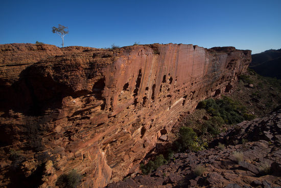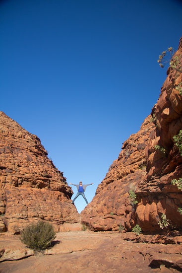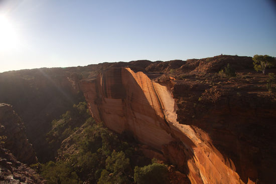 Am nächsten Tag fuhren wir zum ungefähr 300 km entfernten Kings Canyon. Auch dort gibt es einen Walk zu laufen, geht kurz steile Treppen hoch und oben dann teilweise entlang an den 100 Meter hohen steilen Wänden des Canyon. Der Kings Canyon gefiel mir von den Farben her gesehen im Vergleich zum Ayers Rock viel besser. Die Zeit in der wir dort waren, ist defintiv die beste Zeit um ins Red Center zu gehen, da es tagsüber angenehme 20 -25 Grad hat und nicht zu heiß wird.