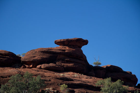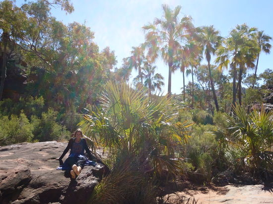 Die Rangerin lief nur einen Teil der Wanderung mit uns und erzählte uns über die Palmen die dort mitten im Outback aus der Erde wachsen und noch viel Interessantes über den Nationalpark. Die Palmen die dort wachsen, nennen sich red cabbage Palms und diese haben dort im australischen Zentrum überlebt wo vor einigen Millionen Jahren noch ein Dschungel war. Durch die umliegenden Sandsteinfelsen wird das Wasser jahrelang gesammelt und kann somit ewig die Palmen mit Wasser versorgen. Nach der Tour nahm die Rangerin Holger mit zu dem Rangerstandort um ein Werkzeug auszuleihen und telefonieren zu können.