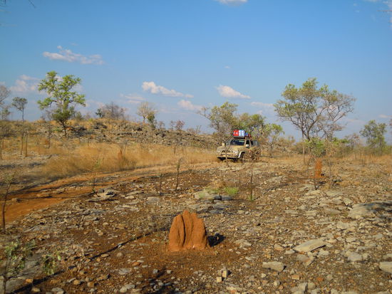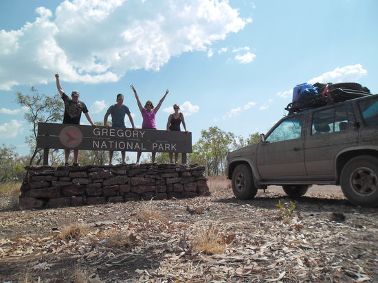 Auf ging es in den Westen Richtung Kimberley. Doch zuerst düsten wir noch in einen anderen Nationalpark hinein, da wir gelesen haben, dass es dort ziemlich krasse Allradstrecken zu fahren gibt. Der Park ist der Gregory NP und liegt ca. 200 km vor der Grenze zu WA (Western Australia). Wir fuhren nur den ersten kleinen Teil des Parks doch der hatte es schon in sich. Die Strecke war besetzt mit endlosen scharfen Steinen und stufenartigen Felsen. Wir dachten dass wir hier definitiv einen Reifen verlieren werden. Doch alles ging gut und wir sind wieder heile aus dem Park heraus gefahren