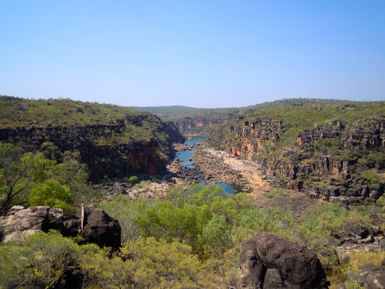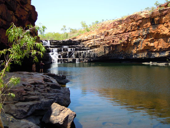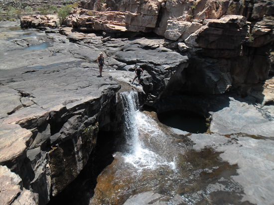 Es ging dann 150 km wieder zurück zum letzten Roadhouse, da wir ja auftanken mussten. Wir schafften es bis dorthin gerade noch mit dem Diesel aus den Kanistern vom Dach. Dort kostete der Diesel "nur" 2,09 Dollar pro Liter Danach fuhren wir die Kalumburu Road noch einmal zur Hälfte hoch, da wir zu den Mitchell Falls wollten. Als wir an der Kreuzung zu den Falls ankamen, pflanzten wir uns gleich in das nächste Camp da wir alle genug von dem Fahren hatten an diesem Tag. Am nächsten Morgen ging es auf holpriger aber superschöner Palmenbesetzen Straße die 70 km zu den Falls. Von dort aus führte ein 8,6 km langer Weg in unbeschreiblicher Hitze an Flüssen und Schluchten vorbei zu den Mitchell Falls. Dort angekommen, verbrachten wir den ganzen Nachmittag mit Schwimmen, relaxen und als es nicht mehr so brennend heiß war, machten wir uns auf den Rückweg.