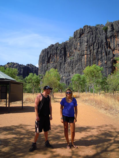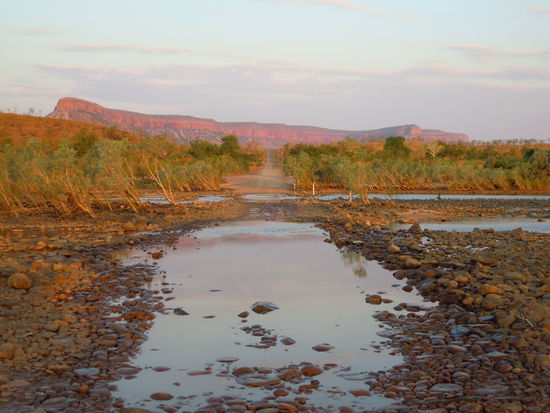 Als wir in Kununurra, das ist die letzte Stadt vor der Grenze und vor den Kimberley, Essen für mindestens eine Woche besorgt hatten, ging es ab auf die Gibb River Road. Die Gibb führt mitten durch die Kimberley Region und ist 660 km lang. Wir hörten von dieser Strecke schon einiges zuvor von den Australiern, die nur meinten: "da verliert ihr alle Reifen und nach einer Weile fängt das Auto an auseinander zu fallen, da es so holprig und uneben wäre". Wir ließen uns davon aber ganz gewiss nicht abbringen, vor allem da diese Straße der schönste Weg ist die Kimberley zu sehen. Und schließlich waren wir auch gut gewappnet mit 2 Ersatzreifen