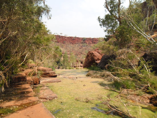 Um zu dem Karijini Nationalpark zu kommen, muss man nach dem 80 Mile Beach, welches einfach nur ein gerader langweiliger Highway ist, ein Stückchen in das Land hinein fahren. Wir besorgten uns wie immer Karten und Informationen aus dem Besucherzentrum und steuerten dann auf die erste sehenswürdige Schlucht zu. Den Namen dazu habe ich leider vergessen, nach so vielen Orten und Namen in denen wir nun schon waren..