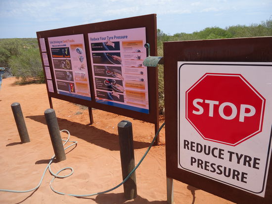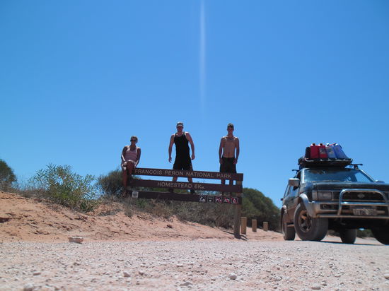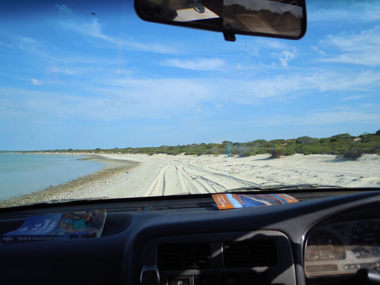 Nach unserem Schnorchelurlaub in Exmouth fuhren wir also weiter die Westküste hinunter zu Shark Bay. Das ist hauptsächlich bekannt für Monkey Mia und den Delfinen. Allerdings hörten wir schon zuvor von einigen, dass dies nur ein Resort wäre, welches ordentlich Geld verlangt um den Delfinen bei der Fütterung zuschauen zu können. Da wir das nicht bezahlen wollten, informierten wir uns im Besucherzentrum von Denham was es sonst noch in Shark Bay zu tun und sehen gäbe. Als wir der netten Dame erzählten, dass wir ziemlich gerne offroad fahren, nannte sie uns den Francois Peron Nationalpark, nördlich von Denham. Wir schauten uns die Karte dazu an und waren uns sofort einig: da fahren wir rein! Die Frau sagte uns noch, dass die Wege dort alle sandig wären und man dazu am Eingang des Parks den Reifendruck reduzieren sollte. Fanden wir super, dass die auch so etwas zur Verfügung stellen - wir konnten es nicht mehr erwarten dort durch den Sand zu düsen