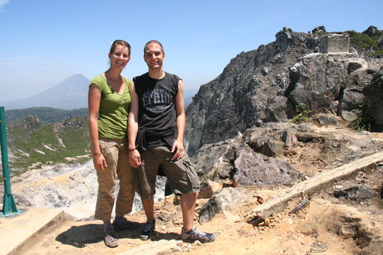 Nicht dass wir nur gegessen und getratscht haetten, nein, unser Hauptgrund fuer den Besuch des Staettchens galt dem Vulkan Gunung Sibayak. Wir brachen am Morgen auf und schnappten uns auf der Strasse einen Public Bus - auf die Strasse stehen, schreien und winken und einsteigen. Der brachte uns an den Fuss des Vulkans und wir machten uns auf den Weg. Nach 2,5h hatten wir die Spitze erreicht und genossen die super Aussicht. An vielen Stellen kommt Schwefel in Gasform aus dem Boden, es brodelt und zischt uns stinkt unglaublich der Abstieg war etwas schwieriger als Gedacht, 2600 Stufen aus Stein in den Urwald gehauen, von denen die Haelfte kaputt waren - schoenen Gruss an die Waden. Unsere deutschen Gueshousefreunde hatten eine halbe Stunde spaeter tatsaechlich eine Kobra am Wegrand gesehen und fotografiert....