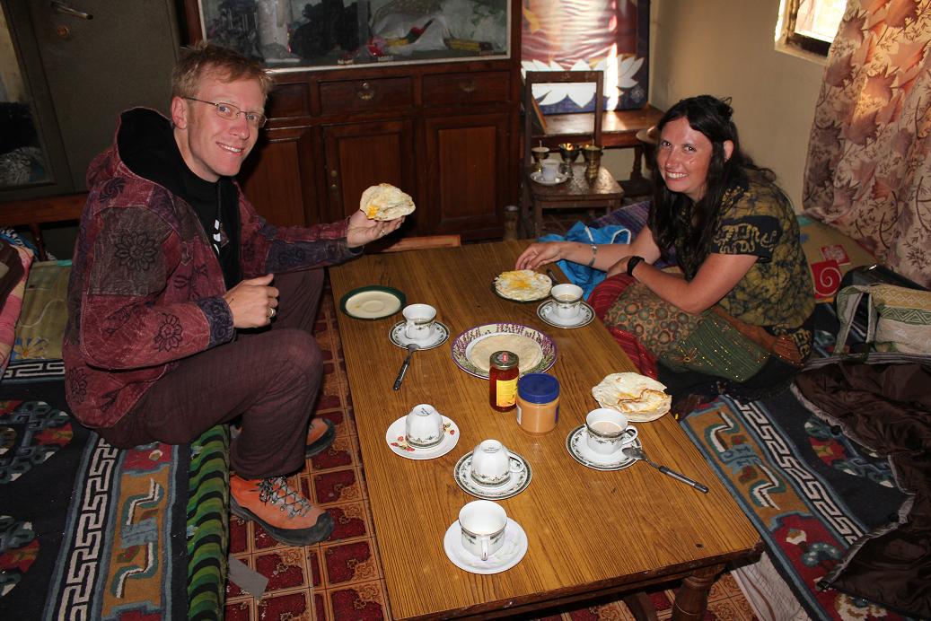 Nach dem Tee gibt es frisch gebackenes Roti (Brot) - das Beste, das ich je gegessen habe. Sie erzählt von einer deutschen Volunteerin, die hier gearbeitet hatte und jeden Tag bei ihr gefrühstückt hat- ich weiß warum! Auf dem Tisch 2 nagelneue Gläser Erdnussbutter und Marmelade, sicher extra für uns gekauft, die Tibetaner und auch Nepali frühstücken definitiv anders!