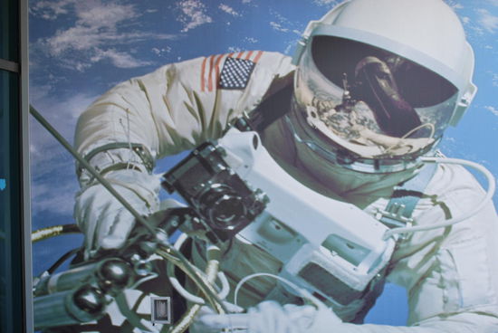 Eingangsbereich mit Astronaut auf dem Dach, ab hier läuft in Endlosschleife als Hintergrundmusik die Space Odyssey