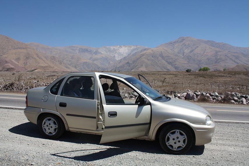 Eigentlich wollten wir um 7:15 Uhr frühstücken gehen, aber Petra (unser wandelnder Wecker) verschläft und so stehen wir erst um kurz nach 7 auf. Frühstück gibt es an der Kneipe um die Ecke (das ist im Zimmerpreis enthalten). Es gibt entweder Croissants oder Tortillas (= typisches Frühstück hier: staubtrockenes salziges Gebäck, das sich "blätterteigmäßig" "aufstapelt" ... die heute waren wirklich überhaupt nicht gut, später haben wir dann ab und an bessere Tortillas bekommen!). Gegen 8:15 Uhr sind wir dann bei Alamo und holen unser Auto für die nächsten Tage ab. Ein staubfarbener (wie praktisch!) Chevrolet Corsa mit schon einigen Schrammen (soll uns nur recht sein!). Petra fährt zuerst. Wir fahren aus Salta raus und dann auf der Ruta 9 (= alte Straße) nach Jujuy. Es ist sehr kurvig und Petra fährt sehr rasant. Ich bin kurz davor, dass mir schlecht wird.