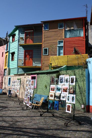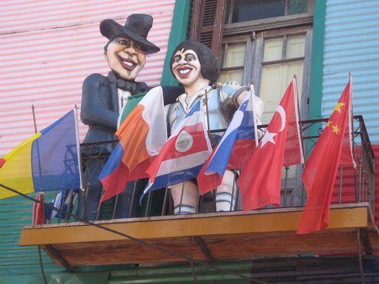 Heute ist schon Freitag und somit der Abreisetag von Jacqi und Clau. Wir frühstücken um 8 Uhr, packen und checken aus. Unsere Rucksäcke deponieren wir im Hostel und mit dem Taxi geht's dann nach La Boca zum Caminito. Die Sonne scheint, der Himmel ist strahlendblau und in La Boca ist noch fast nichts los. Herrlich. Es hat viele bunte Häuser und Maradona ist allgegenwärtig. Wir laufen zum Stadion der Boca Juniors, auch Bombonera (= Pralinenschachtel) genannt. Als wir dann zurück zum Caminito kommen ist dort die Hölle los: Menschenmassen. Gut nur, dass wir heute schon so früh da waren!
