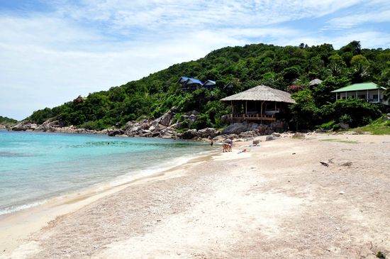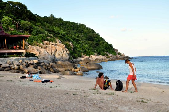 Weil ich mich mit dem Österreicher und seinem Kumpel, den er noch dabei hatte echt gut verstanden hab, haben wir beschlossen noch ein paar Tage auf der anderen Seite der Insel in ner ruhigen Bucht zu verbringen.Sind auch fündig geworden und haben 3 Tage am Ao Leuk verbacht, wo es nur vllt 15 Bungalows gab und auch der Strand deutlich schöner war als der Sairee Beach. Haben uns dann nen Bungalow für 450Baht geteilt, gab zwar nur ein Doppeltbett aber wir Sparfüchse haben einfach zu Dritt drinn geschlafen, kuschlig wars