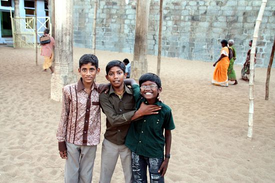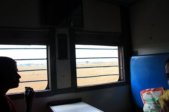 Zum Bahnhof sind es keine 100 Meter die Straße runter. Gestern habe ich mich noch erkundigt und erfahren, dass um 09:30 ein Expresszug nach Trichy fährt. Der kam auch mit nur 15 Minuten Verspätung. Ein junger Inder hatte mich angesprochen und war später mit einem Freund verschwunden. Als der Zug einfährt, stand er wieder in der Nähe und ich fragte ihn, in welchen Wagon ich einsteigen muss. Er meint, dass es keine Reservierung gibt. Es ist aber sowieso genug Platz da.