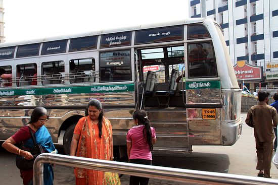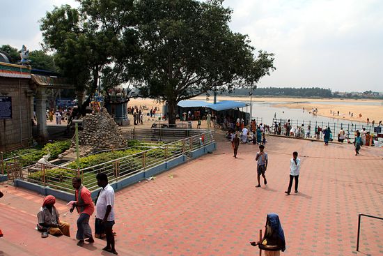 Ohje, heute geht es mir gar nicht gut. Ich habe einen leichten AC-Schnupfen, mir ist übel (war wohl doch was nicht ganz ok mit dem Curry) und die Knochen tun mir weh. Dazu herrscht heute wieder stickige Luft. Trotzdem beschließe ich, den zweiten Tempel auf der Flussinsel vor Trichy anzuschauen. Natürlich muß ich gerade heute die halbe Stunde Busfahrt stehen. Da ich zu Groß bin, muss ich angelehnt, leicht schräg stehen was anstrengt. Dazu muss ich aufpassen, dass ich nicht ständig mit dem Kopf anschlage. Und dann sind wir noch an dem Tempel vorbei gefahren und der Busbegleiter hat erst bescheid gegeben, als wir am Srinagar Tempel waren. Na super. Da der Bus einen Kreis auf der Insel fährt, kann ich auch nicht auf den Gegenbus warten. Dann bleibe ich jetzt gerade sitzen (inzwischen ist ein Sitzplatz frei) und fahre bis zum Ghat, den heiligen Stufen zum Fluss, weiter. Wie in Varanasi gibt es auch hier Treppen für Reinigungszeremonien, nur in kleiner.