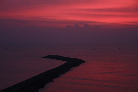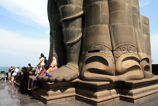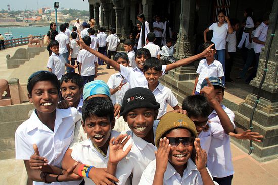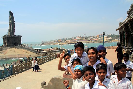 Als nächstes stand das Vivakananda- Denkmal auf dem Programm. Das Denkmal ist auf zwei kleinen Inselchen verteilt, die mit einem kleinen Fährverkehr angelaufen werden. Das Gebäude auf der einen Insel ist schon recht alt. Die Statue auf der Nachbarinsel aber wohl erst vor 5 Jahren gebaut worden. Das Problem ist, dass es nur zwei Fähren gibt, die im Kreis fahren und zu klein sind, um den Andrang zu bewältigen, was dazu führt, dass man insgesamt mit 30 - 45 Minuten Wartezeit auf die Boote rechnen muss.
