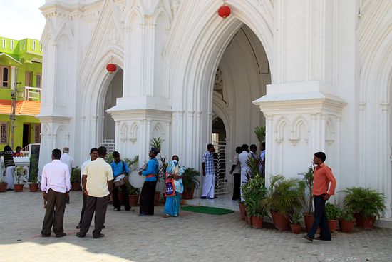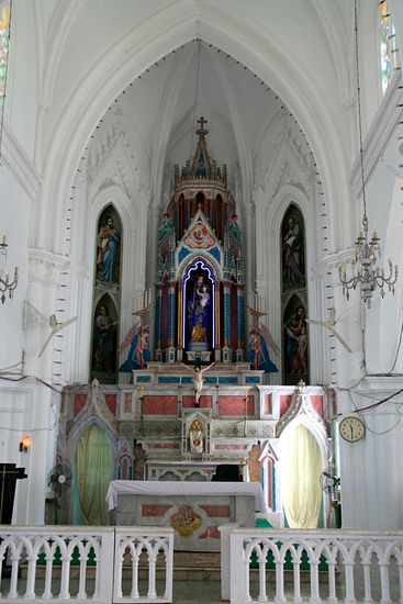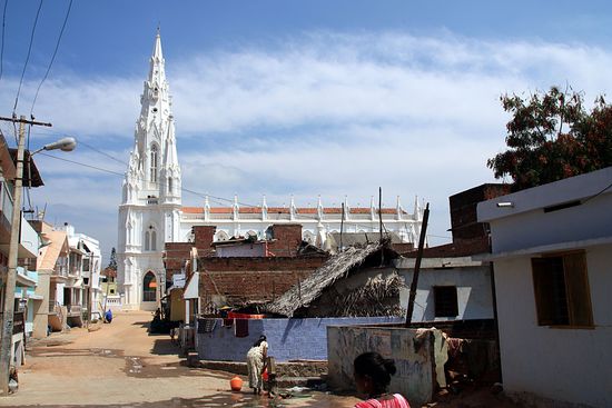 Nach dem Toilettengang bin ich wieder aufgebrochen und habe mir die Kirche angeschaut, die für einen so kleinen Ort erstaunlich groß ausfällt. Die Kirche ist wie wohl die meisten in Indien in gotischem Stil gebaut, aber schneeweiß. Das sieht recht gut aus. Während ich auf die Kirche zulaufe höre ich eine Kapelle spielen uns sehe dann, dass eine Hochzeit stattgefunden hat und die Gesellschaft gerade die Kirche verlässt. Das bedeutet für mich, dass ich mir die Kirche von innen mit voller, bunter Beleuchtung begutachten kann.